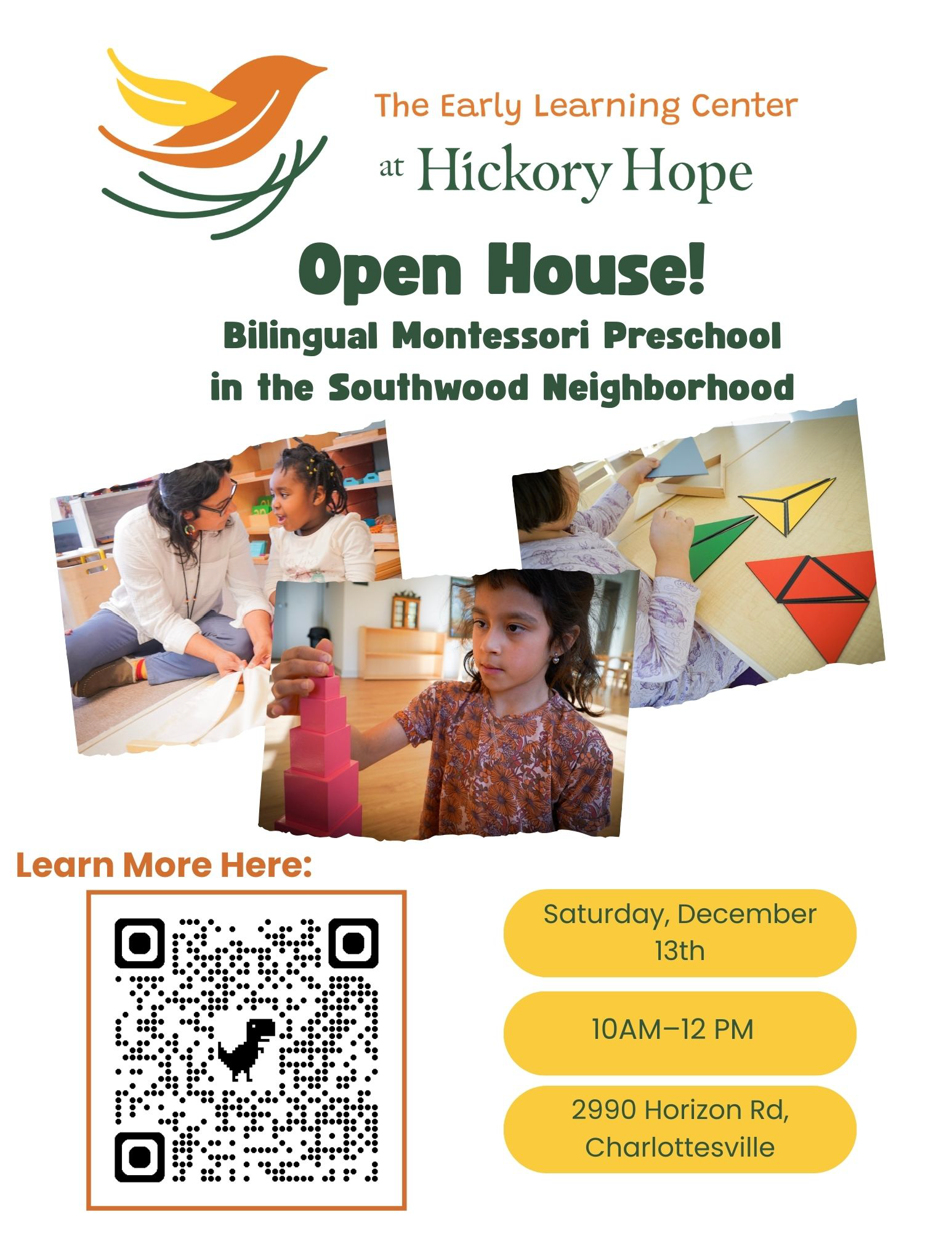 Come discover a warm, engaging, and bilingual Montessori learning environment during our upcoming Open House! This is a wonderful opportunity to explore the new Early Learning Center at Hickory Hope and learn how our approach helps children grow with confidence, curiosity, and independence.